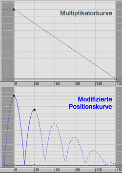 zum Ende der Animation immer niedriger hüpfen, d.h. der Wert der Multiplikatorkurve